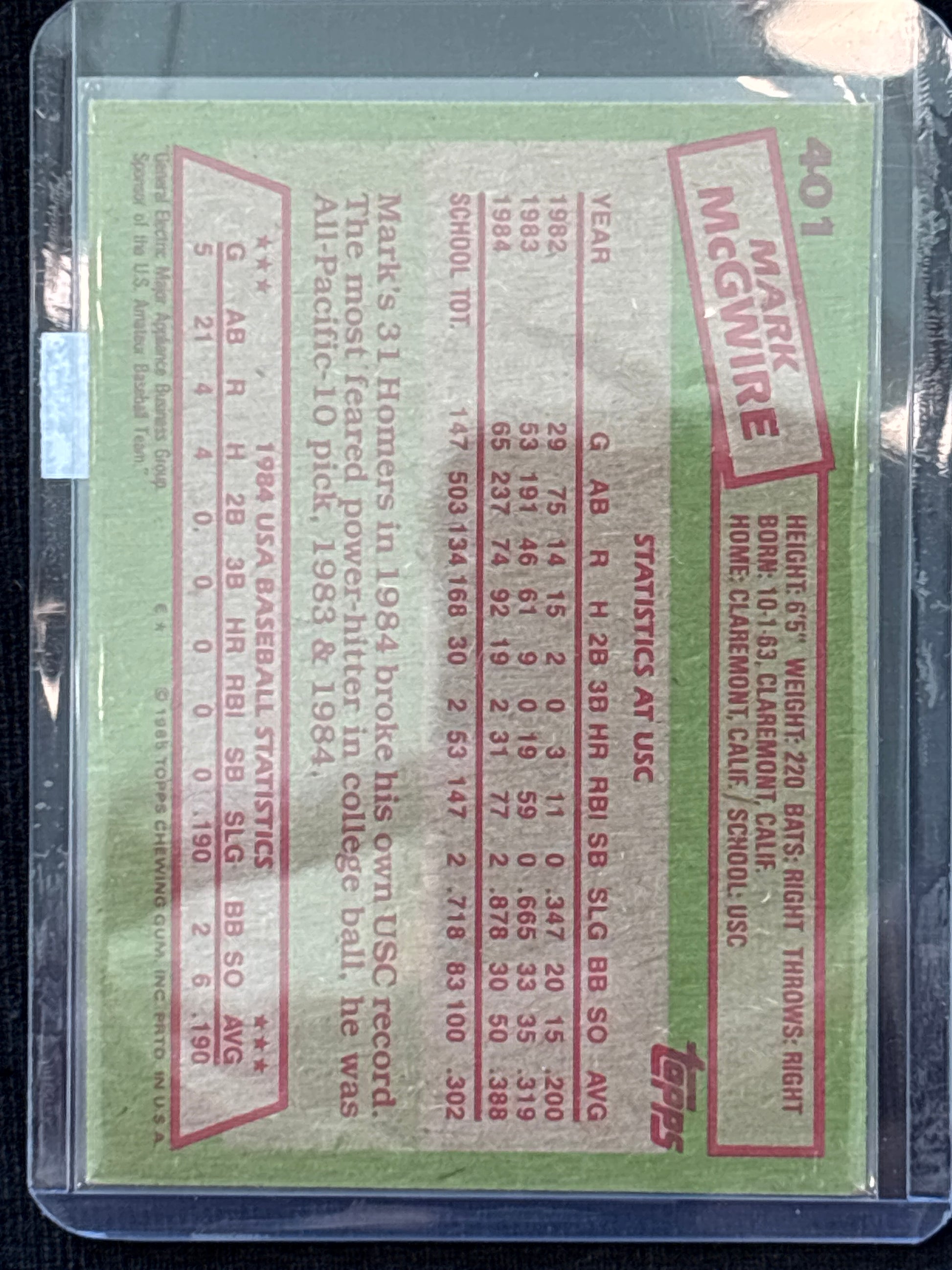 You are purchasing a 1985 Topps Mark McGwire #401 Rookie. You will receive the exact item in the photographs. Thank you for looking. Listed With Mascot.