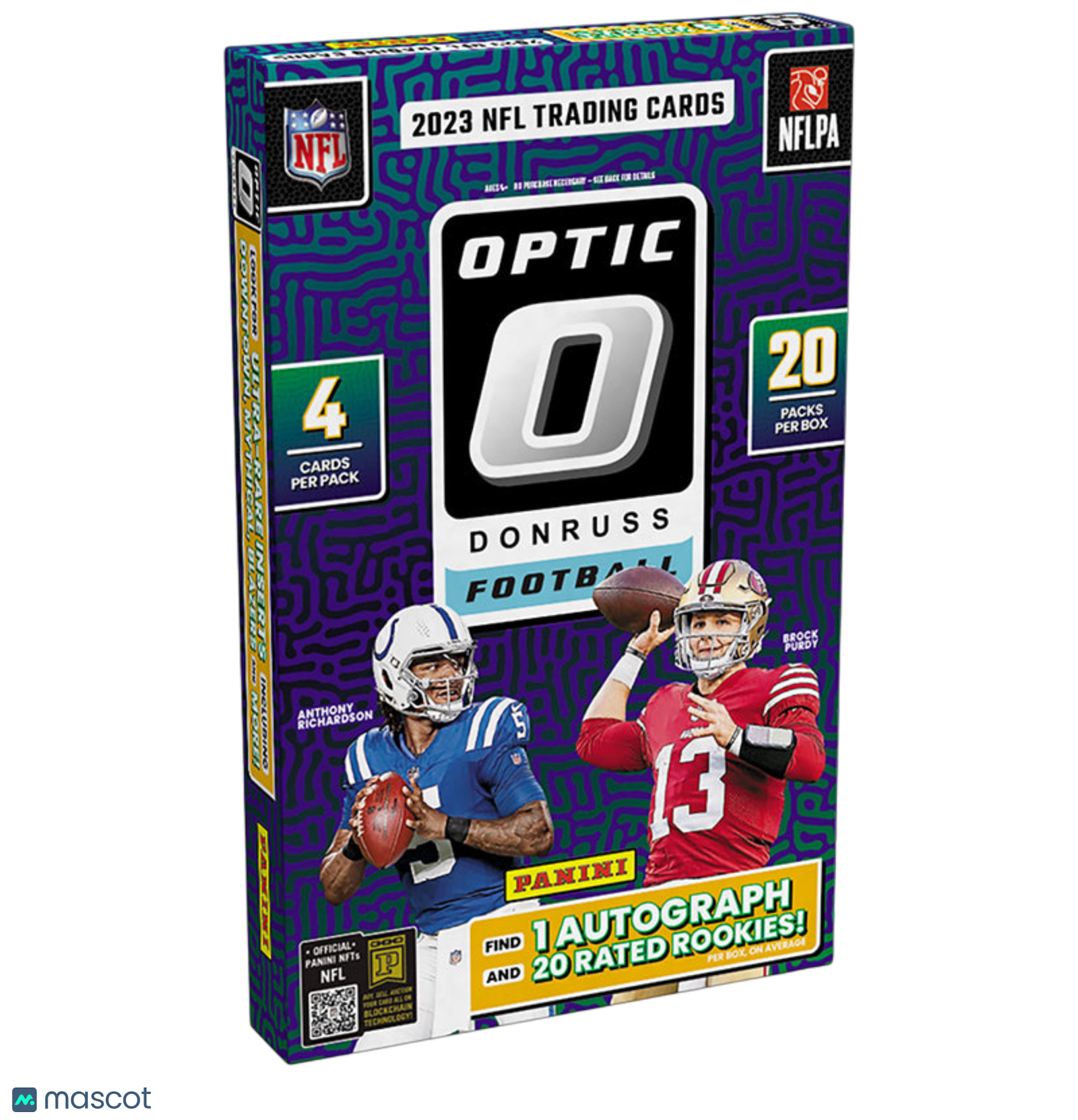 Experience the fusion of Donruss Football and Optichrome technology with the 2023 Donruss Optic Football Hobby Box. This product features the iconic elements that collectors love, including Rated Rookies, My House!, Downtown, and more. Each box guarantees one autograph, showcasing the game’s top stars alongside the hottest rookies, making this release a must-have for fans and collectors alike. Box Configuration: One Autograph, Twenty Rated Rookies, Twelve Parallels (Including Nine Numbered) & Four Inserts! Highlights – 2023 Donruss Football Optic Hobby Features the renowned Rated Rookies and standout insert sets Includes twelve parallels, with nine being serial-numbered Popular insert sets include My House! and Downtown Chase after autographs and eye-catching Optichrome cards Listed With Mascot.