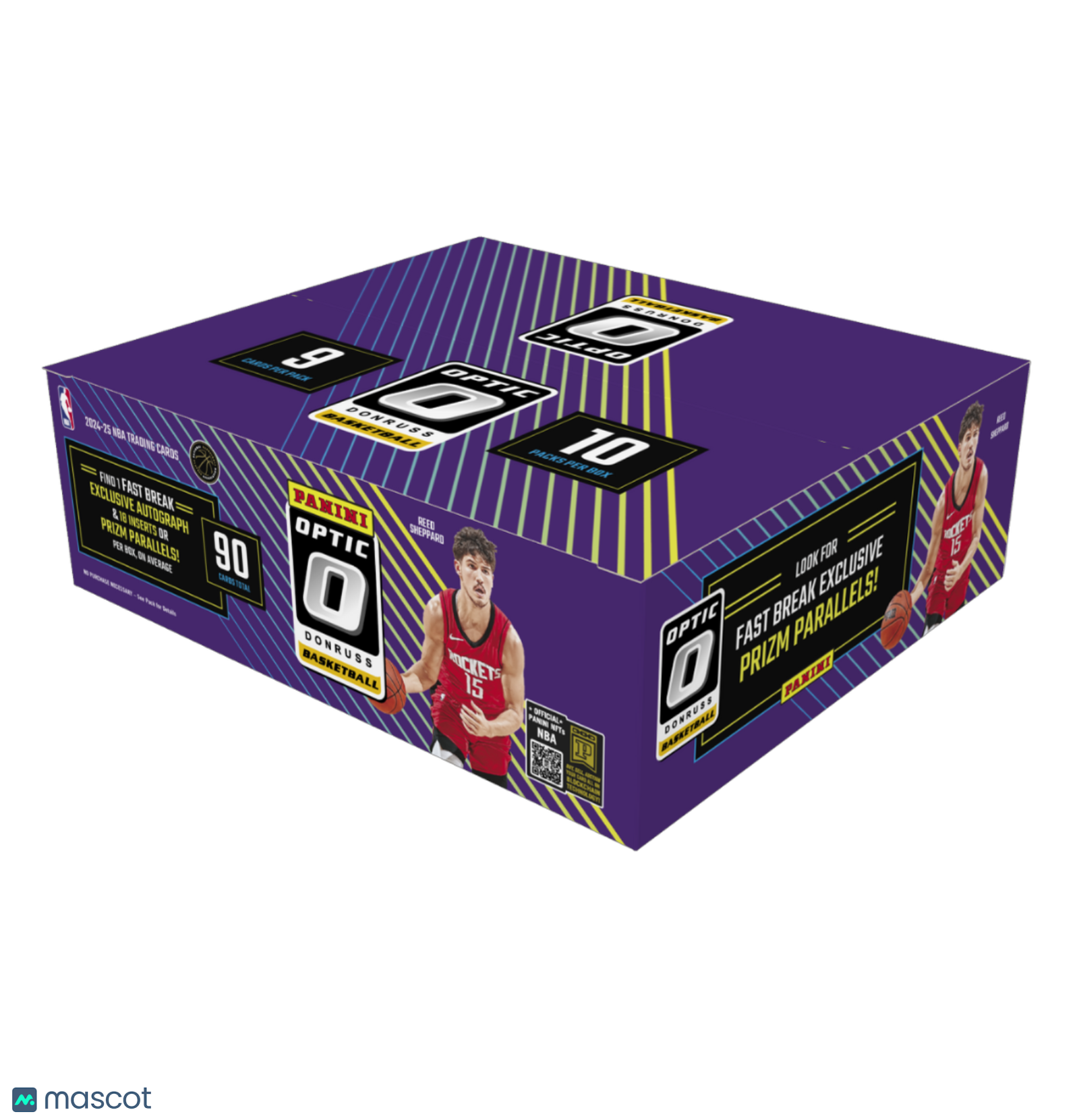 Overview - Chrome-rich Donruss experience in fast-pack format - Exclusive parallels, inserts, and autographs not found in standard hobby boxes Base Set - 300 cards: 225 Base, 50 Rated Rookies, 25 Legends Pack Highlights - 10 packs × 9 cards = 90 cards per box - Avg. box: 1 autograph, 12 parallels, 6 inserts Key Features - Fast Break parallels: Purple /99 to Black /1 - Autographs: Fast Break Signatures & Rated Rookies (Pink /25, Gold /10, Black /1) - Inserts: Net Marvels, Lights Out, Rising Suns & more Listed With Mascot.