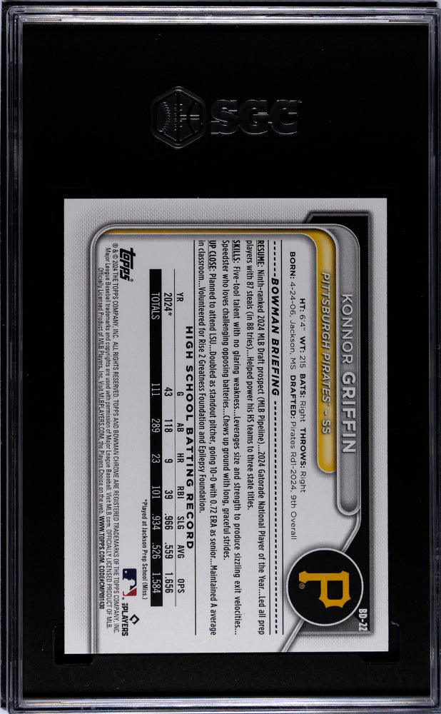 You are purchasing a 2024 Bowman Draft Konnor Griffin #BD-22 SGC 10. You will receive the exact item in the photographs. Thank you for looking. Listed With Mascot.