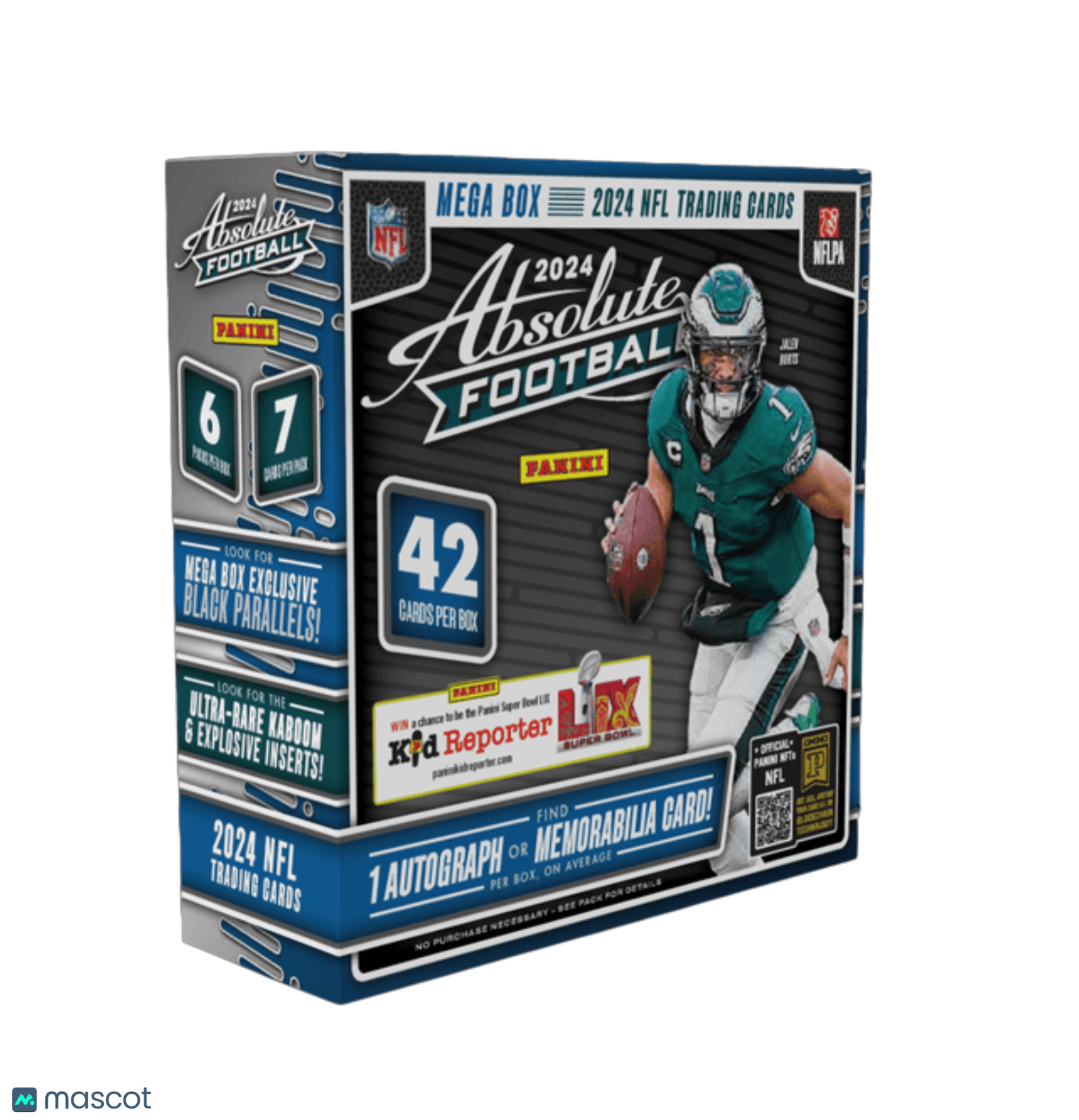 Dive into the excitement of the 2024 Panini Football Absolute Mega box, a must-have for collectors! Each box guarantees one Autograph or Memorabilia Card, along with a rich selection of cards including twelve Rookies, two Inserts, and six Parallels. Expect at least one Base Teal or Rookies Teal per pack! This season, Absolute Football delivers a stacked checklist that features the hottest rookies, the best veterans, and iconic legends, ensuring a thrilling collecting experience. Box Configuration: 6 packs per box, 7 cards per pack (42 total) Highlights – 2024 Panini Football Absolute Mega Twelve Rookies per box for the latest talent Six Parallels and two Inserts, increasing collectibility Look for Ultra-Rare Kaboom and Explosive Inserts Featuring desirable Autograph and Memorabilia Cards Listed With Mascot.
