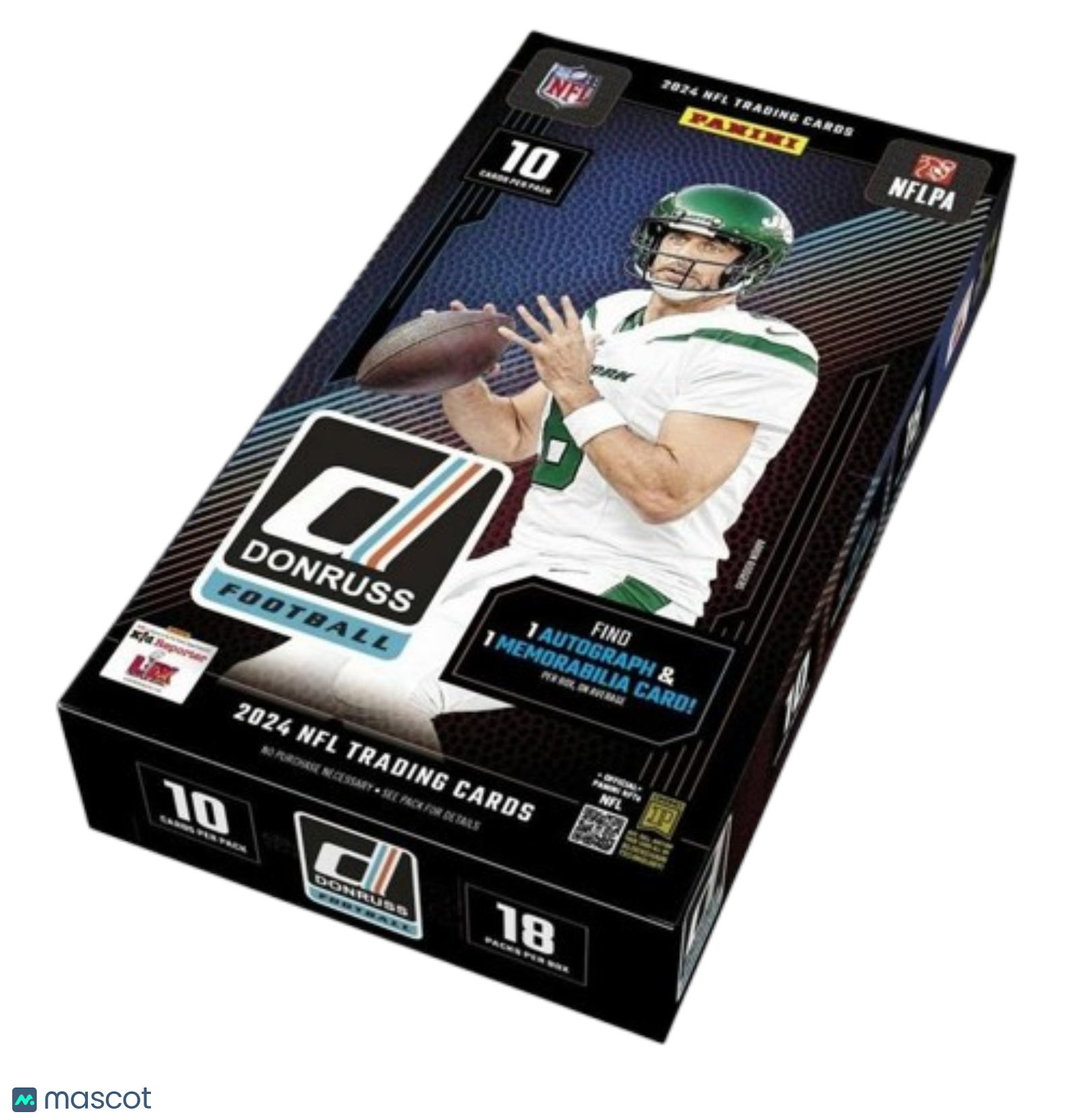 2024 Panini Football Donruss Hobby 2024 Panini Football Donruss Hobby box is a must-have for any collector, featuring an expansive 400-card set. This includes 300 Base cards showcasing veterans and legends, along with 100 Rated Rookies. Each box promises exciting content, with 18 Rated Rookies, 12 Parallels, and 42 Inserts. You’ll also find 1 Autograph and 1 Memorabilia card to enhance your collection.- Box Configuration: 1 Autograph, 1 Memorabilia Card, 18 Rated Rookies, 12 Parallels, 42 Inserts—Highlights – 2024 Panini Football Donruss Hobby- 400-card base set with veterans and legends- 100 Rated Rookies- 12 Parallels including numbered editions- Collectible Inserts featuring top rookies and stars Listed With Mascot.