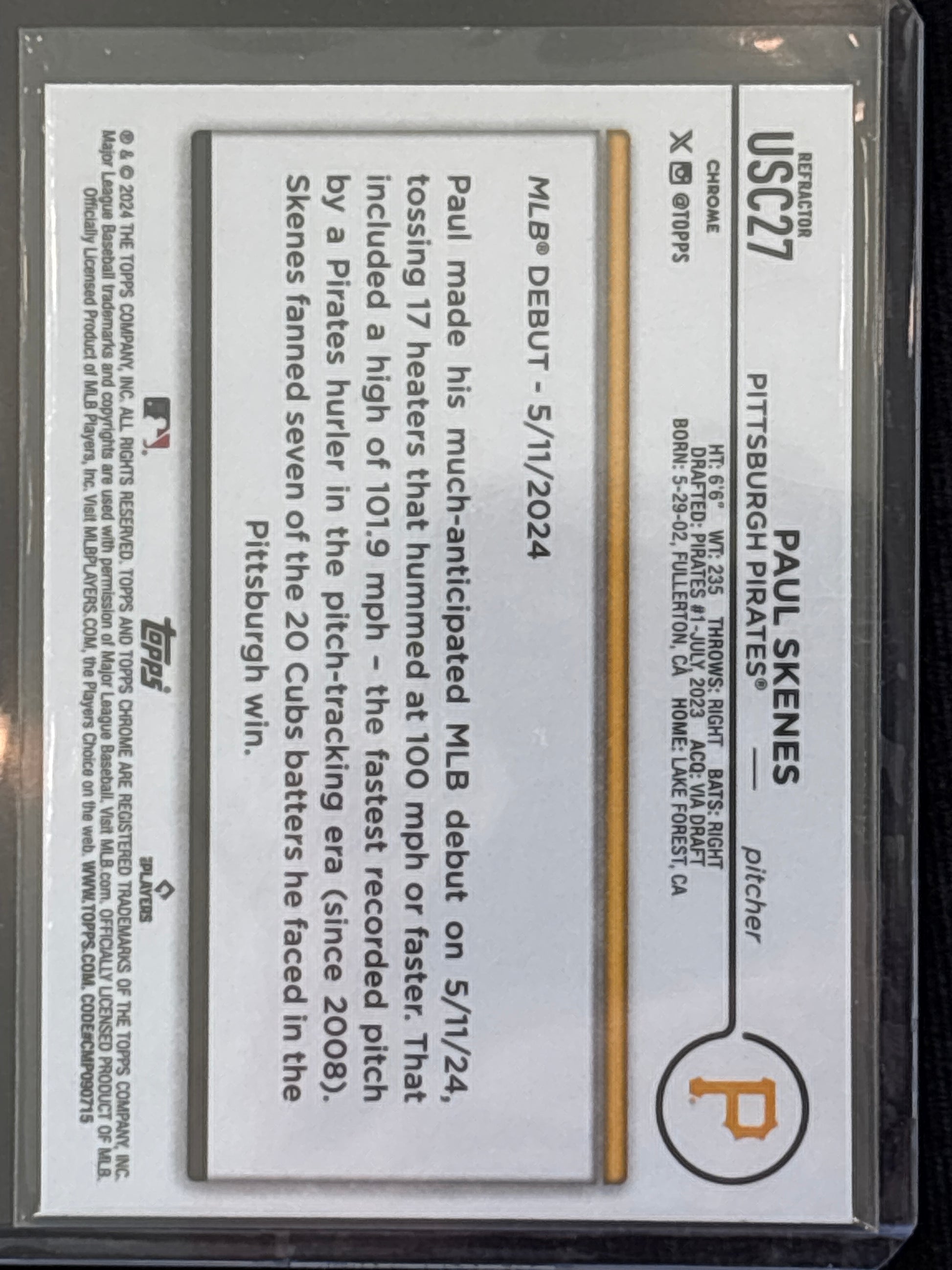 You are purchasing a 2024 Topps Chrome Update Series Paul Skenes #USC27 Mint Rookie RC. You will receive the exact item in the photographs. Thank you for looking. Listed With Mascot.