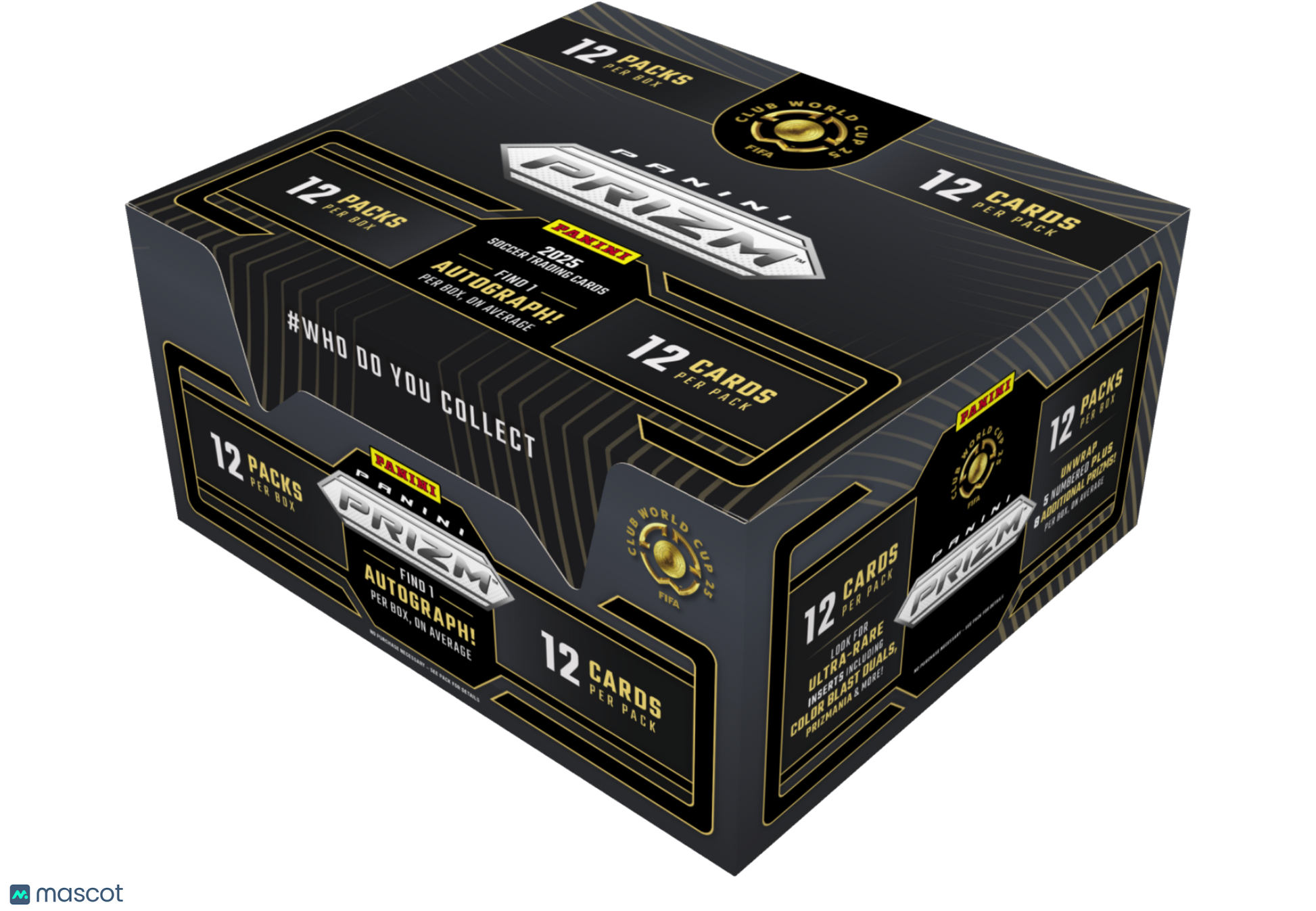 • The debut trading card collection for the FIFA Club World Cup™ is coming this year in Prizm form! • Collect a 200-card base set featuring players from over 25 qualified teams including Manchester City, Chelsea FC, Real Madrid, Juventus, and more! • Look for 5 numbered Prizms per box, on average, including Purple Pandora (#’d/49), Multicolor Mojo (#’d/25) and Gold Vinyl (#’d/1). • The autograph roster for the 2025 edition includes Endrick, Samu Aghehowa, Luiz Henrique, Savinho, and more. • Hunt for a stacked roster of limited inserts including Color Blast Duals, Continental Pride and Kaboom! on Opti-Chrome. Box Break: - 1 Autograph - 5 Numbered Prizms - 8 Additional Prizms - 2 Silver Inserts - 10 Additional Inserts Per box, on average Configuration: - 12 Cards per Pack - 12 Packs per Box - 12 Boxes per Case Listed With Mascot.