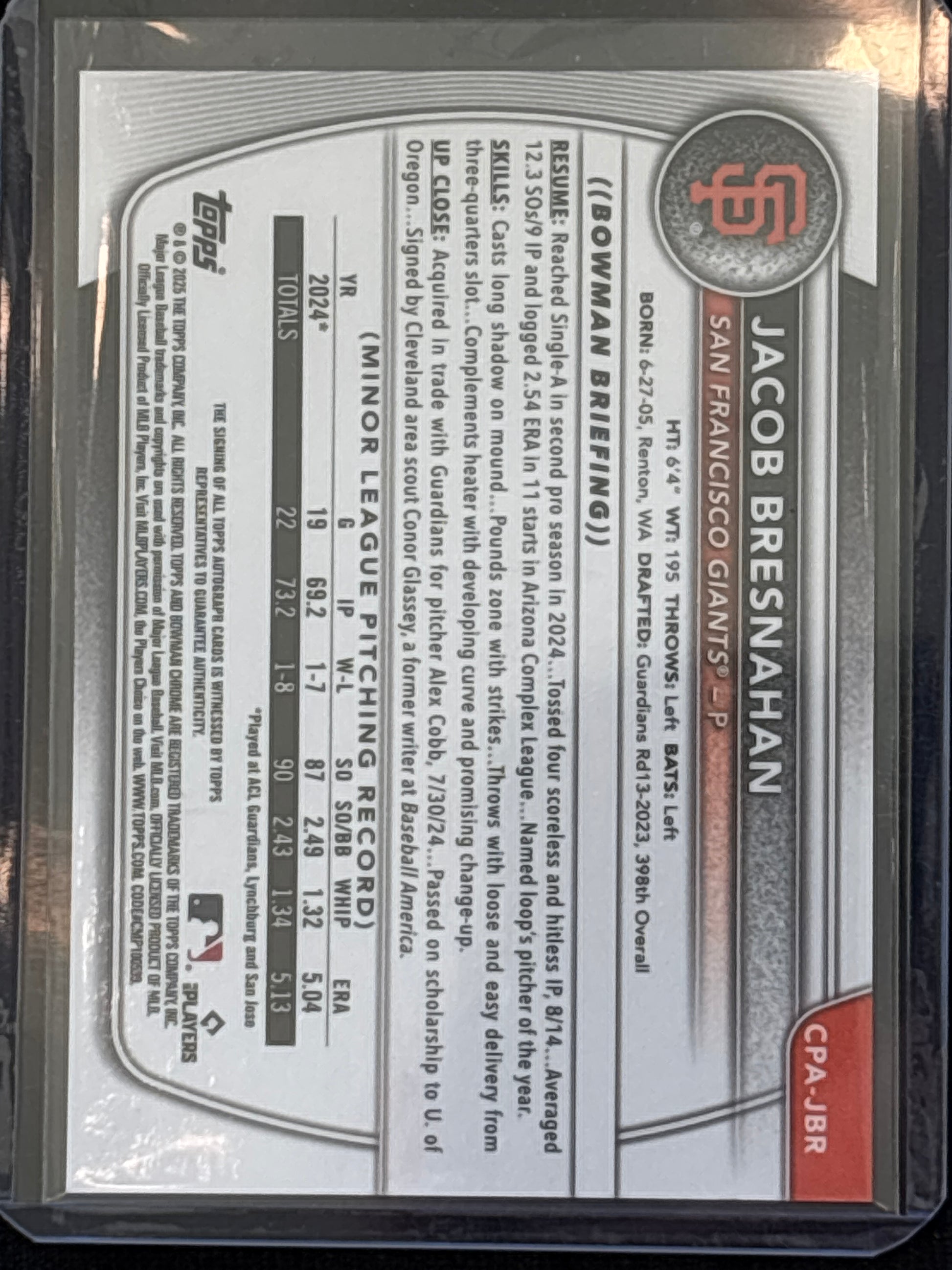 You are purchasing a 2025 Topps Bowman Chrome Jacob Bresnahan #CPA-JBR Speckle Refractor Parallel/Variety Mint 242/299. You will receive the exact item in the photographs. Thank you for looking. Listed With Mascot.